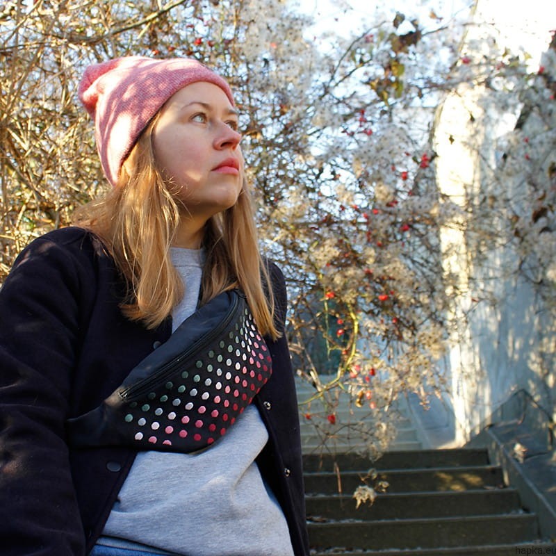 The front one can easily fit a phone, wallet, small notebook or some pens. It’s also big enough for a lipstick or a small mirror so you can be ready for anything. In the back pocket you can keep your documents and a photo of your boyfriend or girlfriend:)